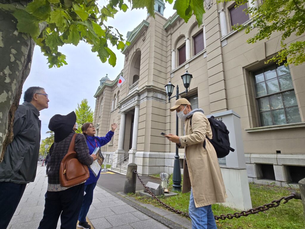 散策ツアーでは、おたる案内人のガイドのもと、色内~山田町~堺町の日本銀行旧小樽支店や旧寿原邸などの日本遺産の構成文化財をめぐりました。