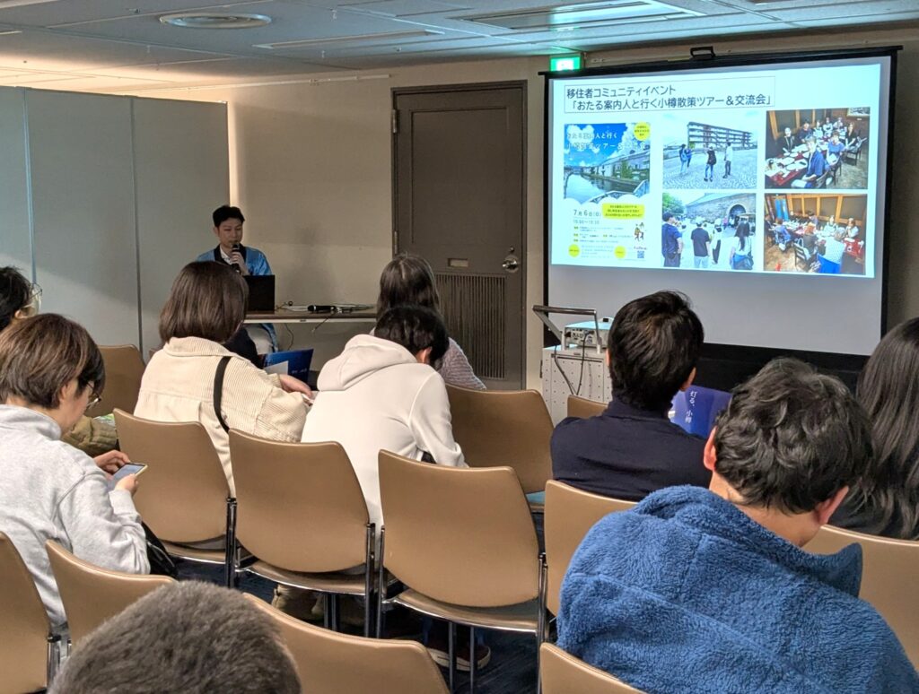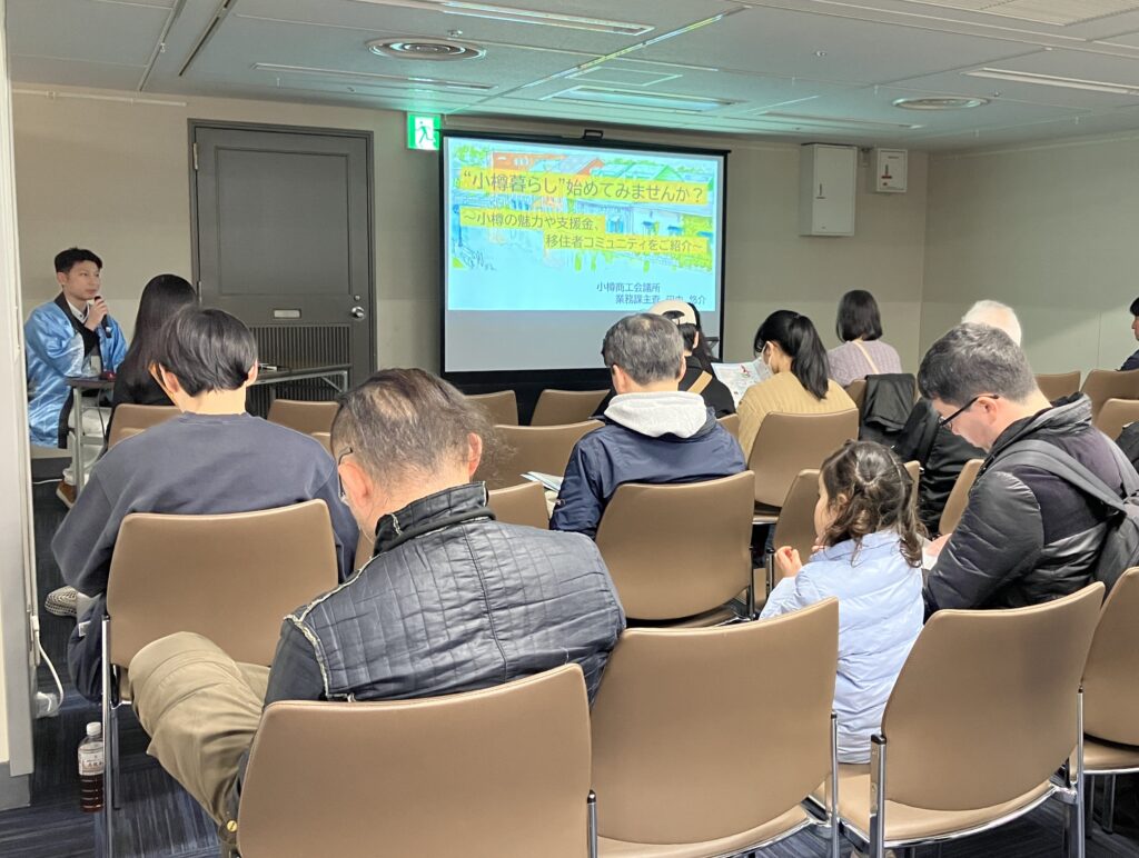 会場では当所職員が移住セミナーに登壇し、「“小樽暮らし”始めてみませんか?」をテーマに小樽の魅力や先輩移住者の紹介、おたる「ひと旗」クラブについて紹介しました。